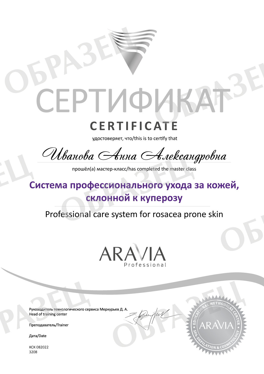 После прохождения мастер-класса участники получат прайс-лист продукции ARAVIA Professional и именной сертификат, подтверждающий прохождение мастер-класса «Система профессионального ухода за кожей, склонной к куперозу».