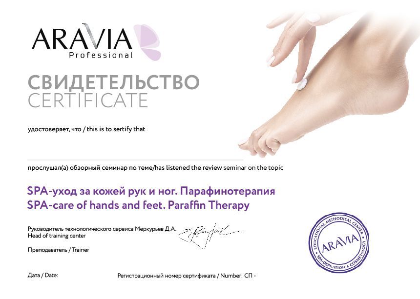 После прохождения курса участники получат необходимые методические материалы, каталоги, прайс-листы и именной сертификат, подтверждающий прохождение обучения по направлению «SPA-уход за кожей рук и ног. Парафинотерапия». Также мастер получает специальную скидку косметолога на весь ассортимент ARAVIA Professional до 40%.